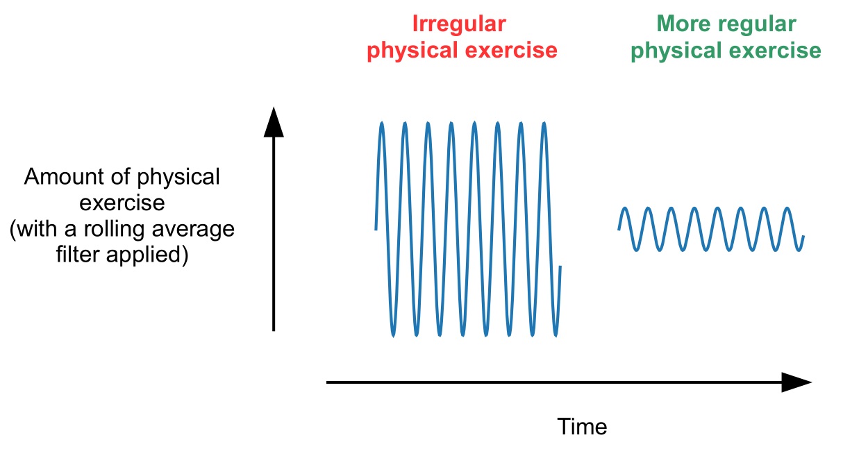 “Regular” means that your physical activity over time should look more like the graph on the right, and less like the graph on the left.